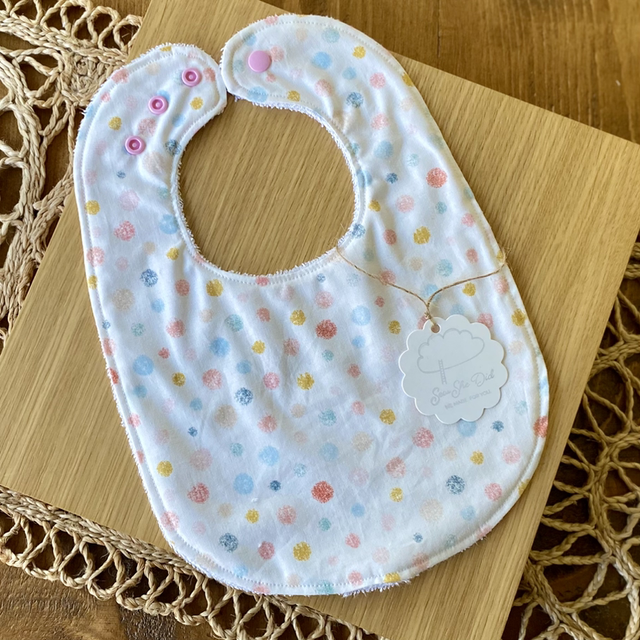 A one size bib with popper fastenings allowing for adjustment around baby's neck, making it ideal for newborn through to toddler age.